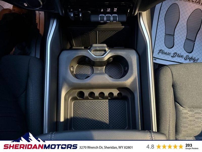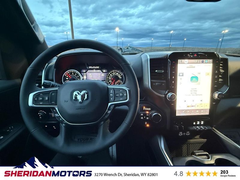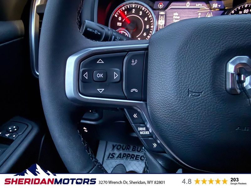Quick Order Package 27Z Big Horn. Big Horn Level 2 Equipment Group: Google Android Auto; SiriusXM Radio Service; USB Host Flip; Power Adjustable Pedals; Leather Wrapped Steering Wheel; Integrated Voice Command with Bluetooth; 12" Touchscreen Display; Glove Box Lamp; Auto Power-Folding Mirrors; 115V Auxiliary Rear Power Outlet; Media Hub with 2 Charge Only USBs; Heated Front Seats; Security Alarm; Black Premium Power Mirrors; Apple CarPlay; Premium Overhead Console; 9 Amplified Speakers with Subwoofer; Disassociated Touchscreen Display; Body Color Fender Flares; Remote Tailgate Release; 115V Auxiliary Power Outlet; LED Dome Lamp with On/off Switch; Universal Garage Door Opener; 2nd Row in Floor Storage Bins; Sun Visors with Illuminated Vanity Mirrors; LED Footwell Lighting; Rear Window Defroster; Integrated Center Stack Radio; Rear View Auto Dim Mirror; Rear Power Sliding Window; Connectivity - US/Canada; GPS Navigation; 4G LTE Wi-Fi Hot Spot; GPS Antenna Input; Overhead LED Lamps; Exterior Mirrors with Heating Element; Auto Dim Exterior Driver Mirror; SiriusXM with 360L; Global Telematics Box Module; Connected Travel and Traffic Services; Heated Steering Wheel; Configurable Drive Mode; 400W Inverter; HD Radio; Deluxe Cloth Bucket Seats; Uconnect 5 Navigation with 12.0" Display Radio; Exterior Mirrors with Supplemental Signals; Steering Wheel Mounted Audio Controls; Exterior Mirrors Courtesy Lamps; Air Conditioning ATC with Dual Zone Control; Cluster 7.0" TFT Color Display; Convex Wide-Angle Exterior Mirror Insert. Night Edition: 275/55R20 OWL All Season Tires; Accent Color Premium Power Mirrors; Exterior Mirrors with Supplemental Signals; Black Headlamp Bezels; Exterior Mirrors Courtesy Lamps; Grille Black Surround Black Mesh; Auto Power-Folding Mirrors; Exterior Mirrors with Heating Element; 20" X 9.0" Aluminum Painted Clad Wheels; Auto Dim Exterior Driver Mirror; Black Exterior Truck Badging; Anti-Spin Differential Rear Axle; Accent Color Door Handles; Accent Color Tailgate Handle; Black Interior Accents; Dual Exhaust with Black Tips; Body Color Front Bumper; Convex Wide-Angle Exterior Mirror Insert; Body Color Rear Bumper with Step Pads; Black Tail Lamp Bezels; RAM Grille Badge - Black; Black Painted Exterior Mirrors Caps. Quick Order Package 23Z Big Horn. 9 Amplified Speakers with Subwoofer. Anti-Spin Differential Rear Axle. 33 Gallon Fuel Tank. Trailer Brake Control. Diamond Black Crystal PC. MyFlexCare Service Plan. MOPAR Front and Rear Rubber Floor Mats. 3.92 Rear Axle Ratio. **Equipment listed is based on original vehicle build and subject to change. Please confirm the accuracy of the included equipment by calling the dealer prior to purchase.**