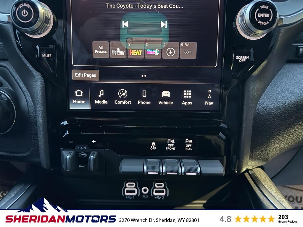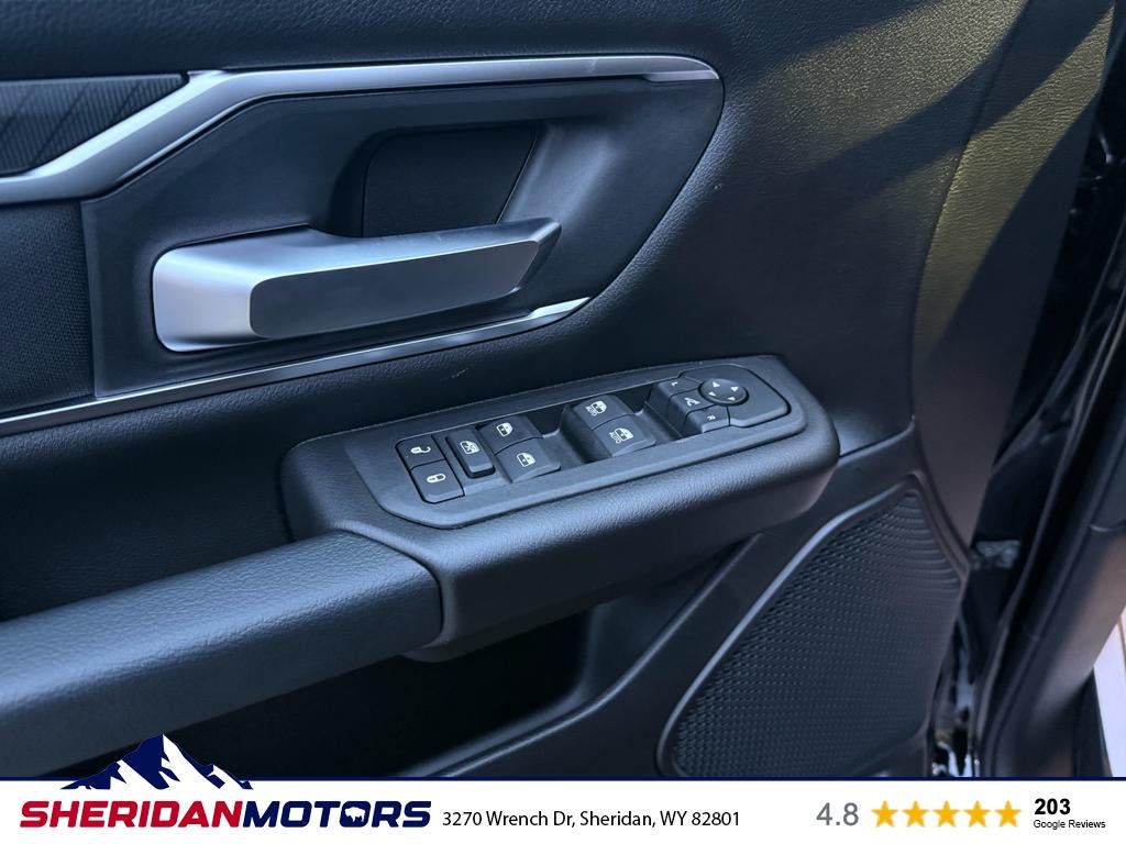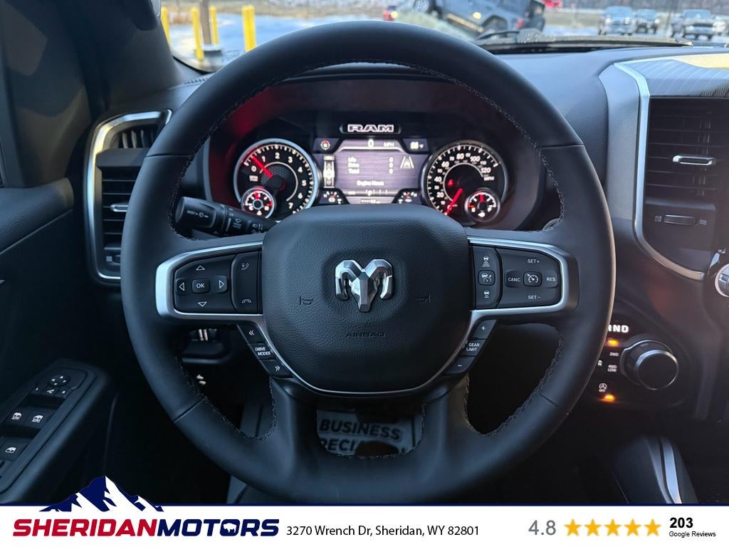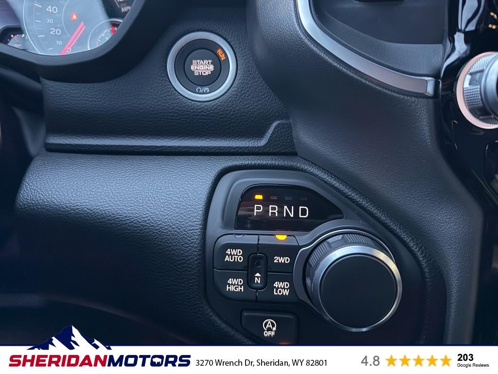 Quick Order Package 27Z Big Horn. Big Horn Level 2 Equipment Group: Google Android Auto; SiriusXM Radio Service; USB Host Flip; Power Adjustable Pedals; Leather Wrapped Steering Wheel; Integrated Voice Command with Bluetooth®; 12" Touchscreen Display; Glove Box Lamp; Auto Power-Folding Mirrors; 115V Auxiliary Rear Power Outlet; Media Hub with 2 Charge Only USBs; Heated Front Seats; Security Alarm; Black Premium Power Mirrors; Apple CarPlay; Premium Overhead Console; 9 Amplified Speakers with Subwoofer; Disassociated Touchscreen Display; Body Color Fender Flares; Remote Tailgate Release; 115V Auxiliary Power Outlet; LED Dome Lamp with On/off Switch; Universal Garage Door Opener; 2nd Row in Floor Storage Bins; Sun Visors with Illuminated Vanity Mirrors; LED Footwell Lighting; Rear Window Defroster; Integrated Center Stack Radio; Rear View Auto Dim Mirror; Rear Power Sliding Window; Connectivity - US/Canada; GPS Navigation; 4G LTE Wi-Fi Hot Spot; GPS Antenna Input; Overhead LED Lamps; Exterior Mirrors with Heating Element; Auto Dim Exterior Driver Mirror; SiriusXM with 360L; Global Telematics Box Module; Connected Travel and Traffic Services; Heated Steering Wheel; Configurable Drive Mode; 400W Inverter; HD Radio; Deluxe Cloth Bucket Seats; Uconnect 5 Navigation with 12.0" Display Radio; Exterior Mirrors with Supplemental Signals; Steering Wheel Mounted Audio Controls; Exterior Mirrors Courtesy Lamps; Air Conditioning ATC with Dual Zone Control; Cluster 7.0" TFT Color Display; Convex Wide-Angle Exterior Mirror Insert. Night Edition: 275/55R20 OWL All Season Tires; Accent Color Premium Power Mirrors; Exterior Mirrors with Supplemental Signals; Black Headlamp Bezels; Exterior Mirrors Courtesy Lamps; Grille Black Surround Black Mesh; Auto Power-Folding Mirrors; Exterior Mirrors with Heating Element; 20" X 9.0" Aluminum Painted Clad Wheels; Auto Dim Exterior Driver Mirror; Black Exterior Truck Badging; Anti-Spin Differential Rear Axle; Accent Color Door Handles; Accent Color Tailgate Handle; Black Interior Accents; Dual Exhaust with Black Tips; Body Color Front Bumper; Convex Wide-Angle Exterior Mirror Insert; Body Color Rear Bumper with Step Pads; Black Tail Lamp Bezels; RAM Grille Badge - Black; Black Painted Exterior Mirrors Caps. Quick Order Package 23Z Big Horn. 9 Amplified Speakers with Subwoofer. Anti-Spin Differential Rear Axle. 33 Gallon Fuel Tank. Trailer Brake Control. Diamond Black Crystal PC. MyFlexCare Service Plan. MOPAR Front and Rear Rubber Floor Mats. 3.92 Rear Axle Ratio. **Equipment listed is based on original vehicle build and subject to change. Please confirm the accuracy of the included equipment by calling the dealer prior to purchase.**