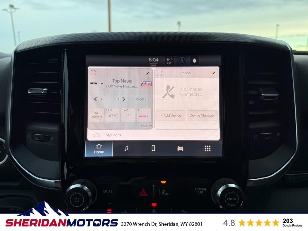 Keep your hands warm all winter with a heated steering wheel in the Ram 1500 . The satellite radio system in this 1/2 ton pickup gives you access to hundreds of nation-wide radio stations with a clear digital signal. Bluetooth® technology is built into it, keeping your hands on the steering wheel and your focus on the road. Apple CarPlay: Seamless smartphone integration for this vehicle - stay connected and entertained on the go! It's Forward Collision Warning feature alerts drivers to potential front-end collisions. The state of the art park assist system will guide you easily into any spot. It has automated speed control that adjusts to maintain a safe following distance, enhancing highway driving convenience. Start the vehicle from inside with remote start. with XM/Sirus Satellite Radio you are no longer restricted by poor quality local radio stations while driving this vehicle. Anywhere on the planet, you will have hundreds of digital stations to choose from.