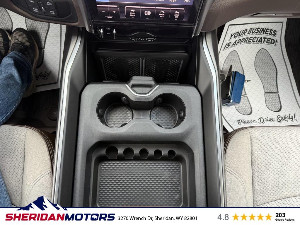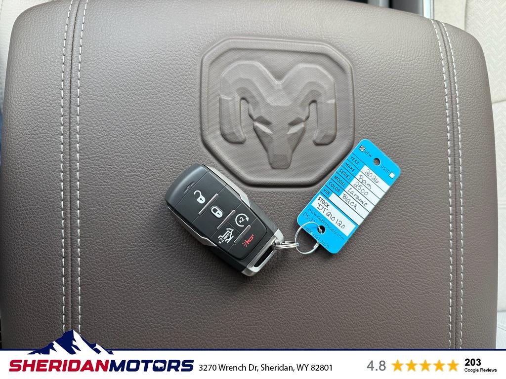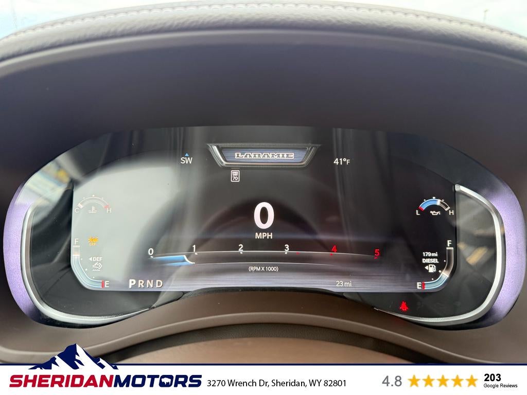 Cold Weather Group: Engine Block Heater; MOPAR Winter Front Grille Cover. Quick Order Package 24H Laramie. Off Road Package: LT275/70R18E OWL On/off Road Tires; Front Performance Tuned Shock Absorbers; Transfer Case Skid Plate Shield; Hill Descent Control; Rear Performance Tuned Shock Absorbers. Towing Technology Group: Surround View Camera System; Trailer Tire Pressure Monitoring System; Trailer Reverse Guidance. Laramie Level 2 Plus Equipment Group: Google Android Auto; SiriusXM Radio Service; Power Adjustable Pedals with Memory; For Details. Visit DriveUconnect.com; For More Info. Call 800-643-2112; Integrated Voice Command with Bluetooth®; Emergency Vehicle Alert System (EVAS); Power Deployable Running Boards; Auto Power-Folding Mirrors; Anti-Spin Differential Rear Axle; Drowsy Driver Detection; Mirror Running Lights; MOPAR Deployable Bed Step; Alexa Built-In; Apple CarPlay; Power-Adjustable Convex Aux Mirrors; Active Lane Management System; Forward and Reverse Utility Lights; Disassociated Touchscreen Display; Remote Tailgate Release; 17 Speaker Harman/kardon Premium Sound; 2nd Row in Floor Storage Bins; Center Stop Lamp with Cargo View Camera; Rain Sensitive Windshield Wipers; LED Bed Lighting; Connectivity - US/Canada; Traffic Sign Recognition; GPS Navigation; 4G LTE Wi-Fi Hot Spot; Adaptive Steering System; GPS Antenna Input; Exterior Mirrors with Heating Element; Auto Dim Exterior Mirror; SiriusXM with 360L; Global Telematics Box Module; Connected Travel and Traffic Services; Foam Bottle Insert (door Trim Panel); Off-Road Info Pages; Selectable Tire Fill Alert; Trailer Tow Pages; Leather Trimmed Bucket Seats; HD Radio; 14.4" Touchscreen Display; Power Heated Fold Telescopic Mirrors with Memory; Exterior Mirrors with Supplemental Signals; Exterior Mirrors Courtesy Lamps; Uconnect 5 Nav with 14.4" Display; MOPAR Spray in Bedliner; Auto High Beam Headlamp Control; Chrome Exterior Mirrors; Exterior Mirrors with Memory; Power Adjust Mirrors; Power Telescoping Mirrors; Auto Dim Exterior Passenger Mirror; Auto Adjust in Reverse Exterior Mirrors. Chrome Bumper Package: Bright Rear Bumper; Bright Front Bumper. Power Deployable Running Boards. Leather Trimmed Bucket Seats. Center Stop Lamp with Cargo View Camera. MyFlexCare Service Diesel. LT275/70R18E OWL On/off Road Tires. Diamond Black Crystal PC. MOPAR Front and Rear Rubber Floor Mats. Transfer Case Skid Plate Shield. **Equipment listed is based on original vehicle build and subject to change. Please confirm the accuracy of the included equipment by calling the dealer prior to purchase.**