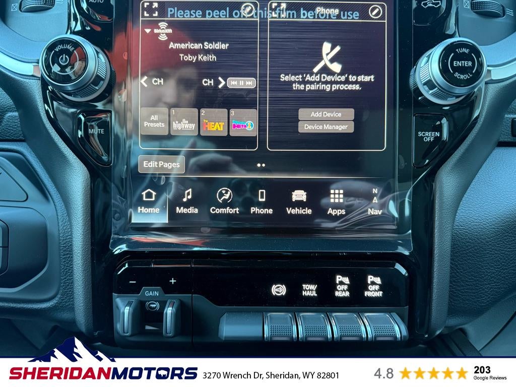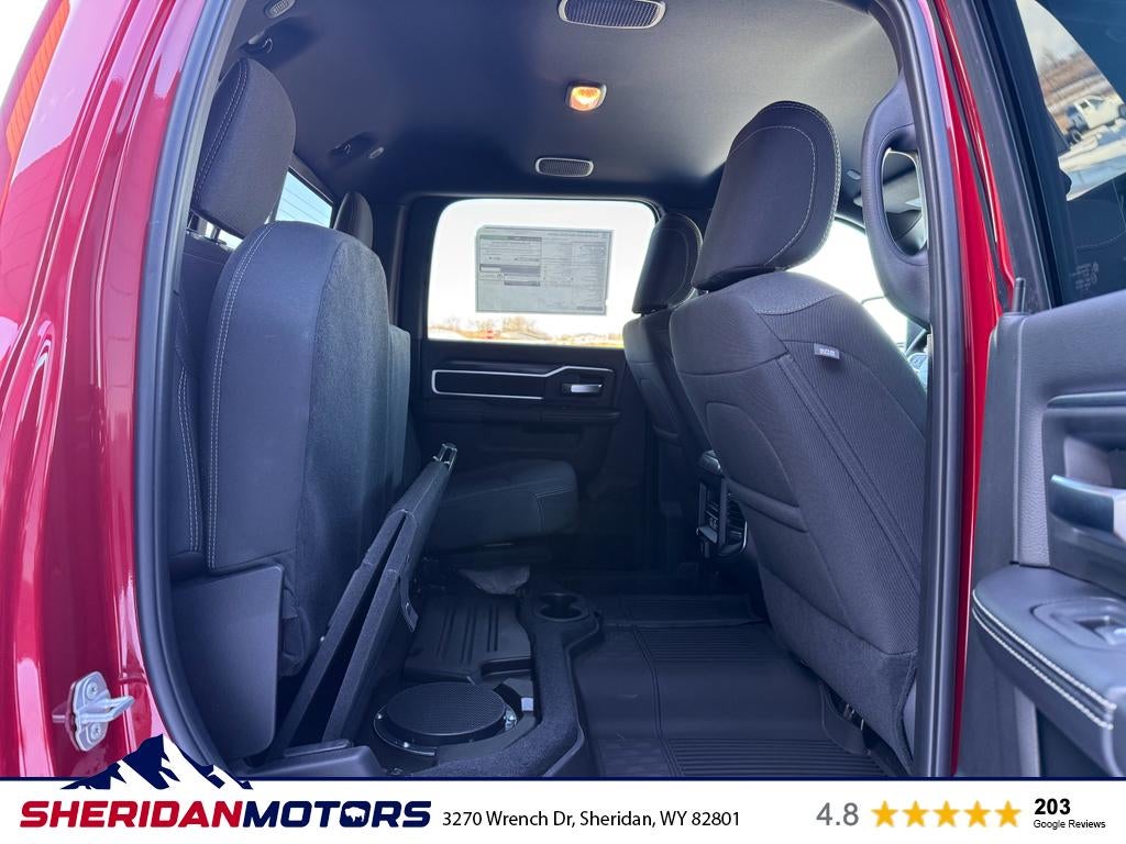 Quick Order Package 24Z Big Horn. Cold Weather Group: Engine Block Heater; MOPAR Winter Front Grille Cover. Big Horn Level 2 Plus Equipment Group: Google Android Auto; SiriusXM Radio Service; Surround View Camera System; Blind Spot and Cross Path Detection; For Details Visit DriveUconnect.com; Power Adjustable Pedals; For More Info. Call 800-643-2112; Integrated Voice Command with Bluetooth®; Emergency Vehicle Alert System (EVAS); 12" Touchscreen Display; Glove Box Lamp; Auto Power-Folding Mirrors; Footwell Courtesy Lamp; Drowsy Driver Detection; Heated Front Seats; Mirror Running Lights; MOPAR Deployable Bed Step; Exterior 115V AC Outlet; Alexa Built-In; Apple CarPlay; Premium Cloth Bucket Seats; Power-Adjustable Convex Aux Mirrors; Active Lane Management System; Forward and Reverse Utility Lights; Locking Lower Glove Box; Remote Start System; 9 Alpine Speakers with Subwoofer; Disassociated Touchscreen Display; Dual Wireless Charging Pad; Trailer Tire Pressure Monitoring System; Dual Glove Boxes; 115-Volt Auxiliary Front Power Outlet; Universal Garage Door Opener; 2nd Row in Floor Storage Bins; Sun Visors with Illuminated Vanity Mirrors; Center Stop Lamp with Cargo View Camera; Rain Sensitive Windshield Wipers; Rear View Auto Dim Mirror; Rear Power Sliding Window; Rear Dome with On/off Switch Lamp; LED Bed Lighting; Connectivity - US/Canada; Traffic Sign Recognition; GPS Navigation; 4G LTE Wi-Fi Hot Spot; Adaptive Steering System; GPS Antenna Input; Exterior Mirrors with Heating Element; SiriusXM with 360L; Global Telematics Box Module; Connected Travel and Traffic Services; Heated Steering Wheel; Foam Bottle Insert (door Trim Panel); Black Exterior Mirrors; Dampened Tailgate; Trailer Reverse Guidance; Big Horn Instrument Panel Badge; Off-Road Information Pages; Selectable Tire Fill Alert; Trailer Tow Pages; 400W Inverter; HD Radio; Uconnect 5 Navigation with 12.0" Display Radio; Power Heated Fold Telescopic Mirrors; Exterior Mirrors with Supplemental Signals; Steering Wheel Mounted Audio Controls; Exterior Mirrors Courtesy Lamps; Air Conditioning ATC with Dual Zone Control; MOPAR Spray in Bedliner; Auto High Beam Headlamp Control; Cluster 7.0" TFT Color Display; Power Adjust Mirrors; Luxury Steering Wheel; Power Telescoping Mirrors. Quick Order Package 2UZ Big Horn. Blind Spot and Cross Path Detection. MyFlexCare Service Diesel. Premium Cloth Bucket Seats. 50 Gallon Fuel Tank. Remote Start System. Molten Red Pearlcoat. MOPAR Front and Rear Rubber Floor Mats. Rear Wheelhouse Liners. Power 2-Way Driver Lumbar Adjust. Transfer Case Skid Plate Shield. **Equipment listed is based on original vehicle build and subject to change. Please confirm the accuracy of the included equipment by calling the dealer prior to purchase.**